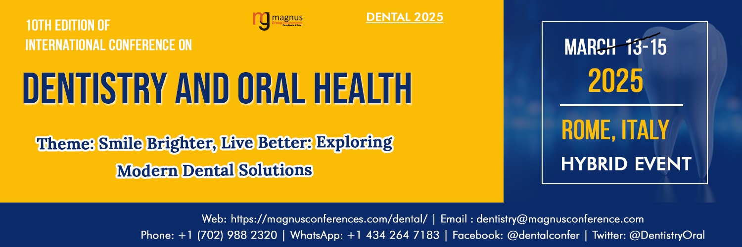 Experience the transformative 10th Edition of the International Conference on Dentistry and Oral Health, where innovation meets excellence in dental care. Join us from March 13-15, 2025, for Dental 2025, either onsite at Rome, Italy, or virtually from anywhere in the world. With a hybrid format tailored for accessibility, Dental 2025 provides an inclusive platform for dental professionals and experts.