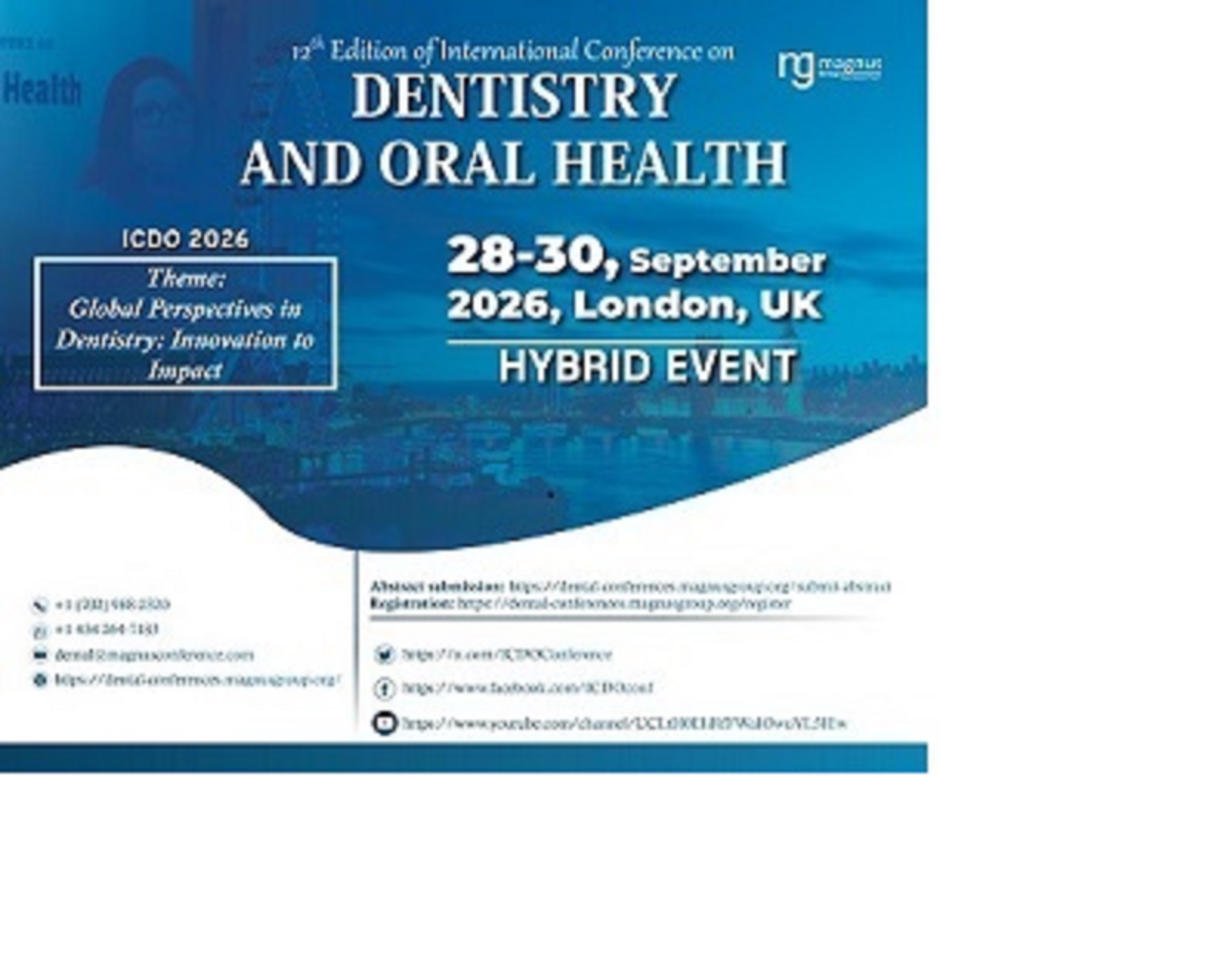 Magnus Group is pleased to welcome you to the 12th Edition of International Conference on Dentistry and Oral Health (ICDO 2026), taking place from September 28-30, 2026, in London, UK and Online. Guided by the theme “[Theme]”, this hybrid event offers a valuable opportunity for dental professionals, oral surgeons, researchers, clinicians, and academics to come together in a collaborative and multidisciplinary setting.