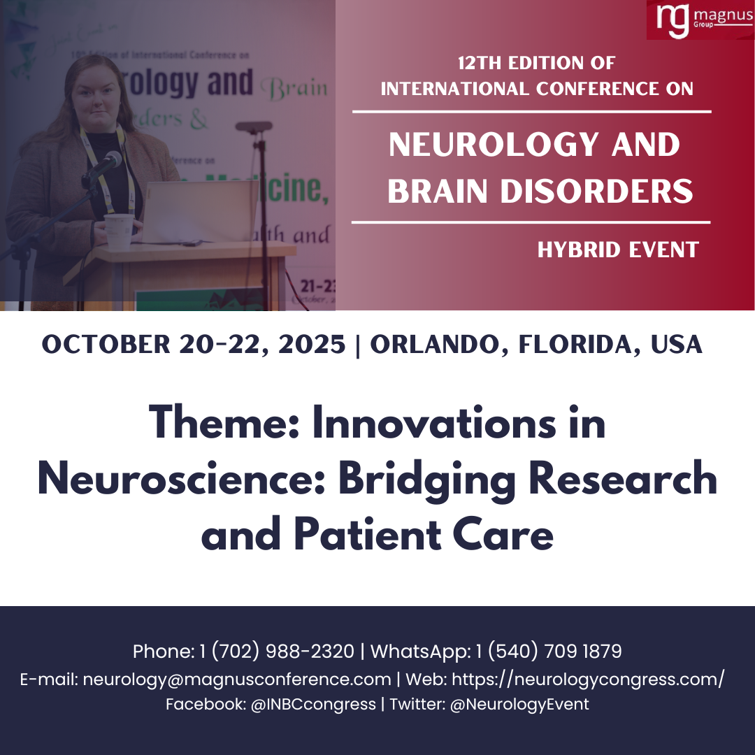 Mark your calendars for the 12th Edition of the International Conference on Neurology and Brain Disorders (INBC 2025), set to take place from October 20-22, 2025, in the vibrant city of Orlando, Florida, USA! This hybrid Neurology Conferences 2025, available both onsite and online, promises an engaging platform for a diverse audience of neurology professionals, researchers, and enthusiasts.