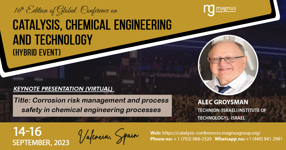 16th Edition of Global Conference on Catalysis, Chemical Engineering & Technology has been announced by Magnus Group. Catalysis Event is scheduled to take place in Valencia, Spain from September 14-16, 2023. Catalysis Summit will offer a platform for researchers, industry leaders, and regulatory officials to share their latest findings, innovative methodologies, and advancements in catalysis and chemical engineering. Chemical Engineering Conferences will be held both in-person and virtually to accommodate participants’ preferences and provide a broader outreach to interested individuals. Catalysis 2023 main focus is to expedite future endeavours in the field of catalysis and chemical engineering. Attendees can expect to gain knowledge and insights into traditional and cutting-edge topics, technology, and applications from the industry’s leading experts. Catalysis Conference will provide an excellent opportunity for senior experts, young