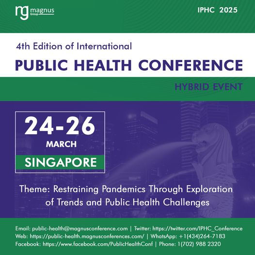 Prepare to mark your calendars for the highly anticipated 4th Edition of the International Public Health Conference, slated for March 24-26, 2025, in Singapore. This edition promises an innovative hybrid experience, offering both in-person attendance in Singapore and virtual participation from across the globe.