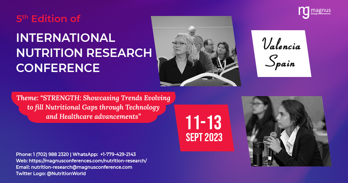 We are delighted to invite you to attend the “5th Edition of International Nutrition Research Conference” to be held in Valencia, Spain from September 11-13, 2023. This conference has gained tremendous interest and follows the success of previous editions.