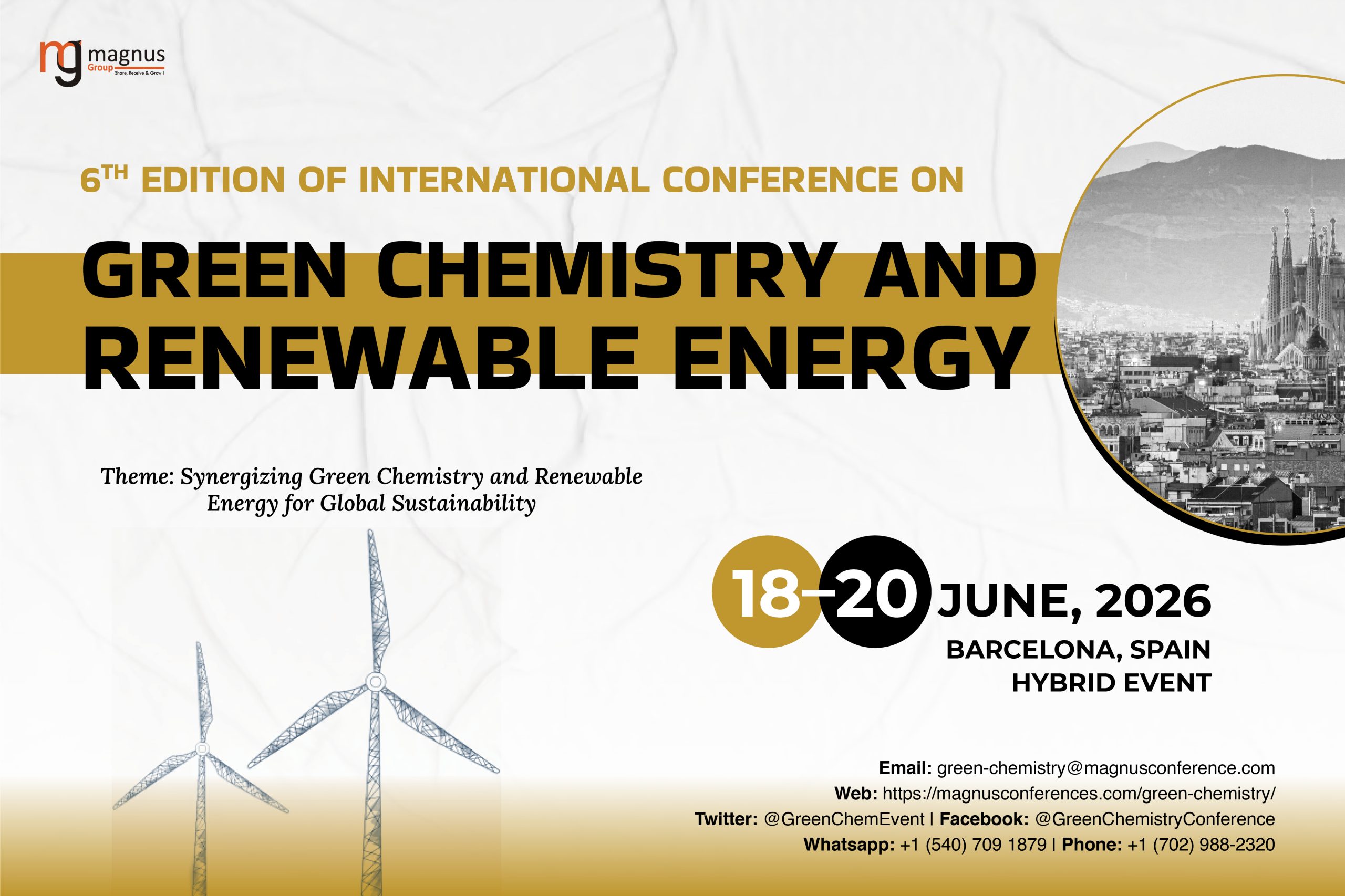The 6th Edition of International Conference on Green Chemistry and Renewable Energy, Green Chemistry 2026, will be held from June 18-20, 2026, in Barcelona, Spain, with virtual participation also available. This hybrid event facilitates broad engagement, bringing together global experts from academia, industry, government, and research institutions. The conference revolves around the theme “Synergizing Green Chemistry and Renewable Energy for Global Sustainability”, emphasizing interdisciplinary collaboration and innovation in sustainable chemical processes and renewable energy technologies.