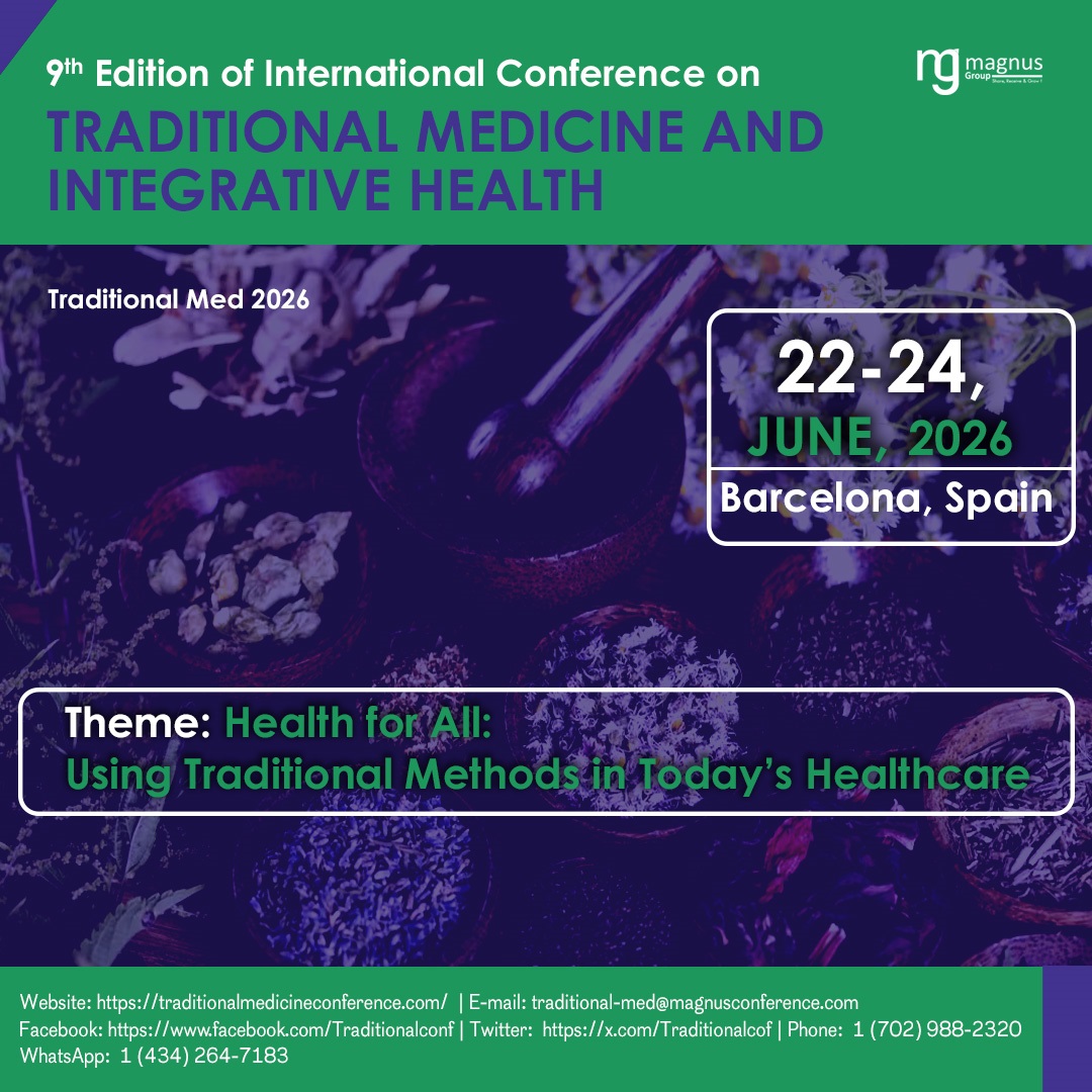 The 9th Edition of International Conference on Traditional Medicine and Integrative Health (Traditional Med 2026) is set to take place from June 22 to 24, 2026, in Barcelona, Spain and Virtually. Organized around the theme “Health for All: Using Traditional Methods in Today’s Healthcare”, the conference aims to strengthen collaboration and knowledge exchange within the global traditional medicine community.
