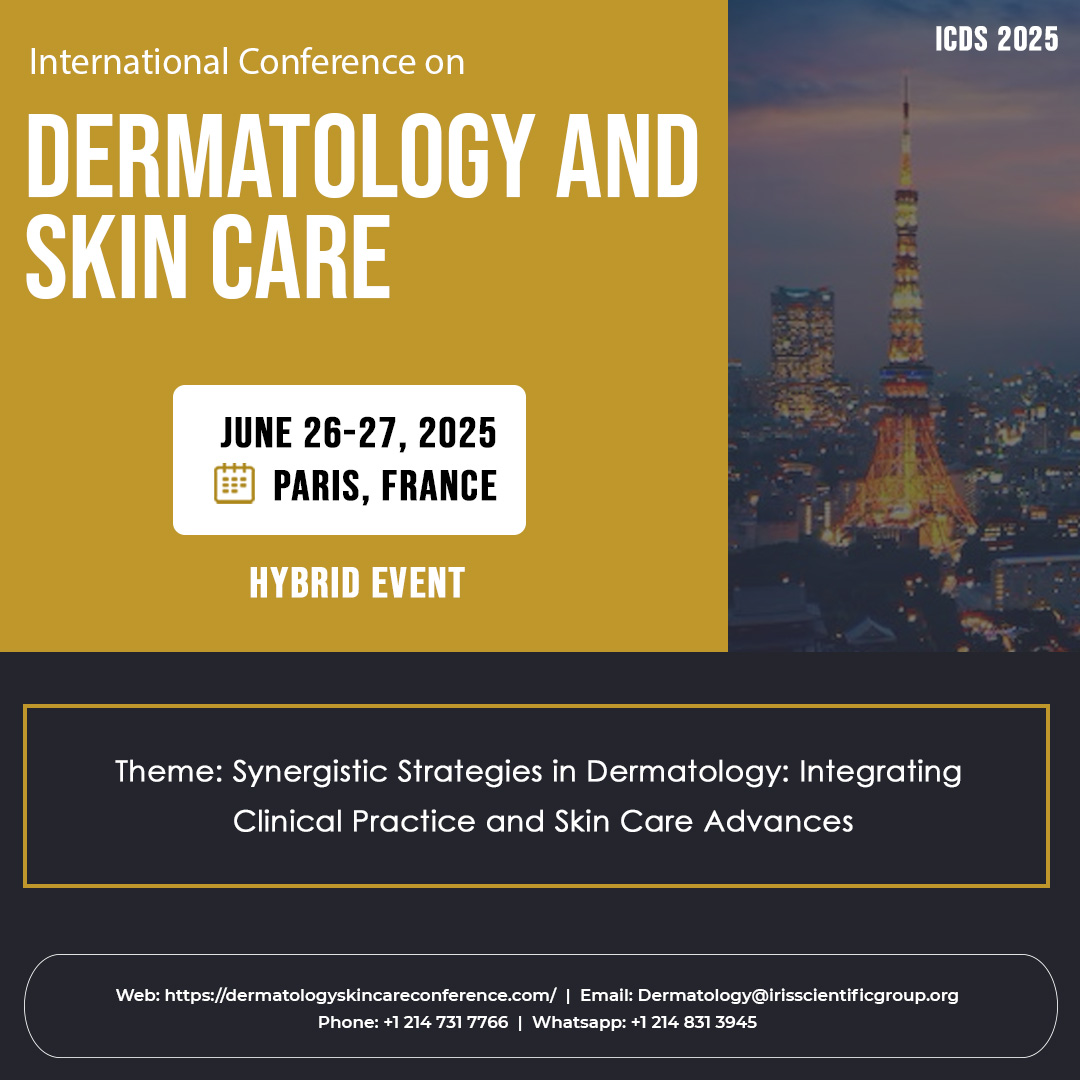 The International Conference on Dermatology and Skin Care (ICDS 2025), organized by the Iris Scientific Group, will take place in Paris, France, on June 26-27, 2025. This distinguished conference is also accessible virtually, allowing participants from around the world to engage with the event seamlessly from their locations. ICDS 2025 offers a unique platform for professionals in dermatology and skin care to explore the latest advancements and trends in the field.